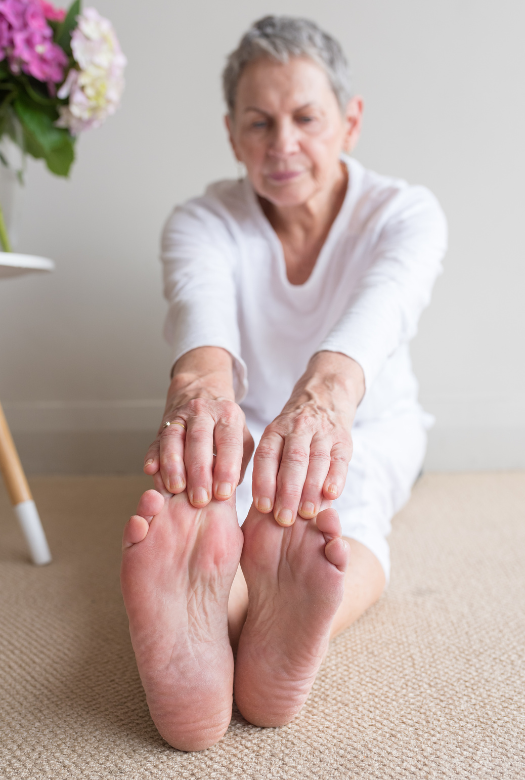 Foot problems in older people are shown to be associated with falls., Specific risk factors include foot pain, stiffness at the ankle, having a bunion, and reduced toe strength. Additionally, toe deformities and the presence of corns and calluses are common contributors to a person’s falls risk that we see in our clinic because of the way that they can alter a person’s gait and therefore stability.