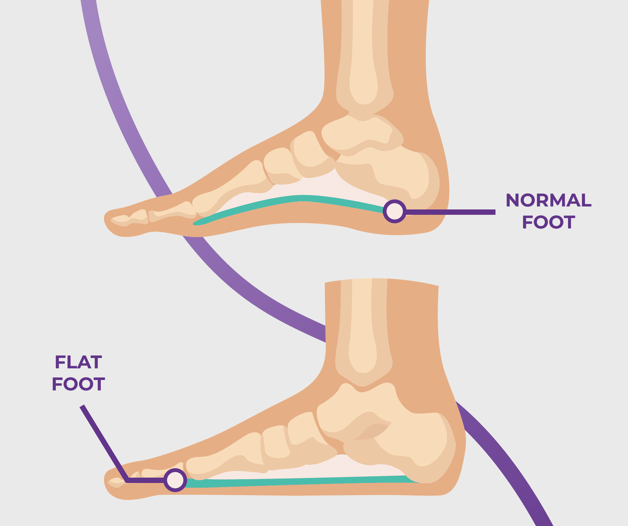 Having flat feet means that instead of having a natural arch along the inside edge of your feet when you stand, you have no visible arch,