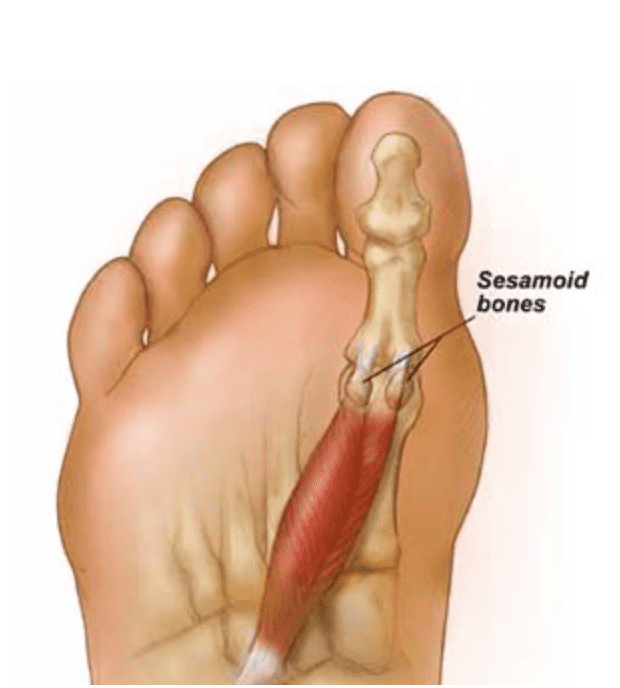 Your sesamoids are two small pea-shaped and sized bones that sit right below your big toe joint at the ball of the foot. They are not directly connected to the big toe joint in the same way all of the other bones are connected via regular joint, but instead they are embedded within a tendon that runs directly beneath your big toe called the flexor hallucis brevis. Here, they support the function of the tendon as you walk and run. Thus, moving this tendon while you have sesamoiditis will produce painful symptoms.