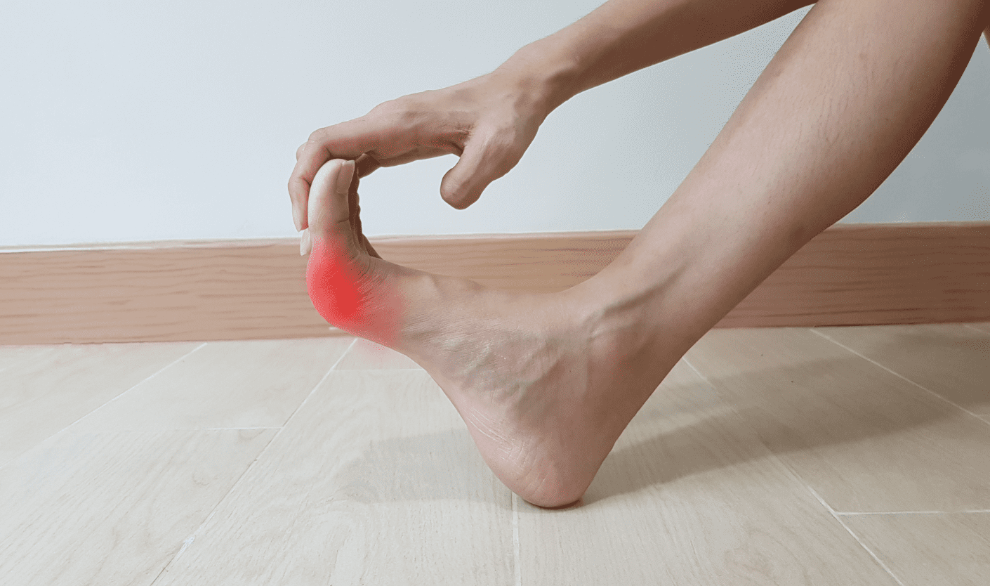 Sesamoiditis is one of the leading causes of pain beneath the big toe joint at the ball of the foot during physical activity. You may also notice some swelling or redness around the joint, and bending your toe upwards will likely feel tender. Often, sesamoid pain starts as a mild ache and gradually worsens, although it can come on suddenly too, especially if you haven’t noticed the discomfort building up. You’ll typically feel better when resting, and physical activity or loading the ball of your foot will exacerbate your pain.
